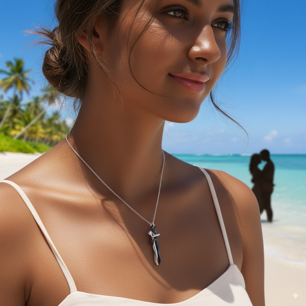 Descripción: Este collar representa una figura de pareja abrazándose, simbolizando amor, unión y conexión.