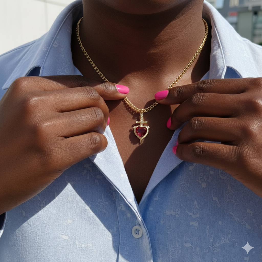 El Collar de Corazón y Espada es un manifiesto de dualidad: la fuerza y la sensibilidad, el deseo y la protección, lo que entregamos y lo que nos reservamos. Un diseño cargado de simbolismo para quienes no temen mostrar su historia, con todas sus cicatrices.